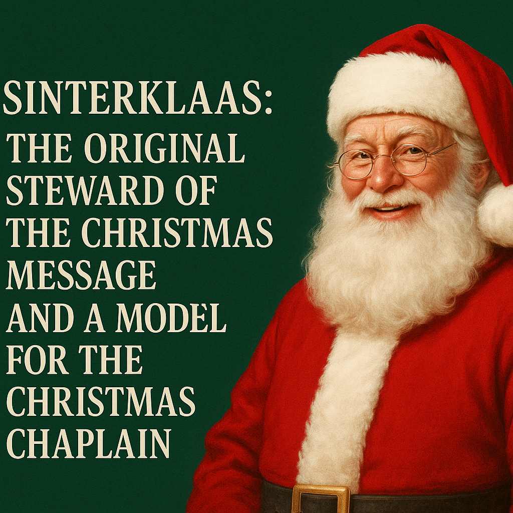A festive banner for the article “Sinterklaas: The Original Steward of the Christmas Message and a Model for the Christmas Chaplain.” The design features a cheerful Santa Claus in his classic red suit, white beard, and round glasses, smiling warmly against a deep green background. The article title is displayed in bold white serif text on the left side of the image.