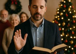 Chaplain leading a Christmas blessing with family gathered in prayer beside a decorated tree – Top 7 Christmas Blessings You Can Lead as a Chaplain