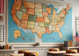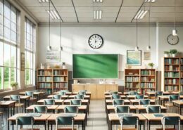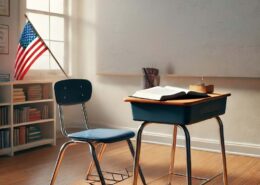 Empty classroom desk with notebook, American flag, and legible whiteboard text symbolizing the call to be a public school chaplain