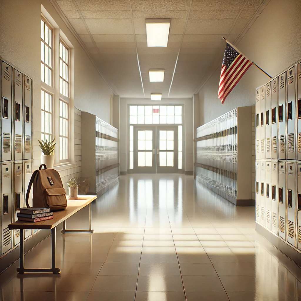 Empty school hallway with lockers and a backpack, symbolizing schools as a place of purpose and support